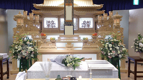 | 生花祭壇6尺(1.8m) | 窓付内外高級布貼り新棺 |
